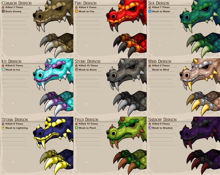 The Dragons... these legendary creatures were first summoned by Dudley as his final guardians. Once he has been defeated, these guys would run amok and become the bosses of everyday battles. There's no question that they possesses the highest HP and attack power as they would either claw or send elemental breaths at the player.