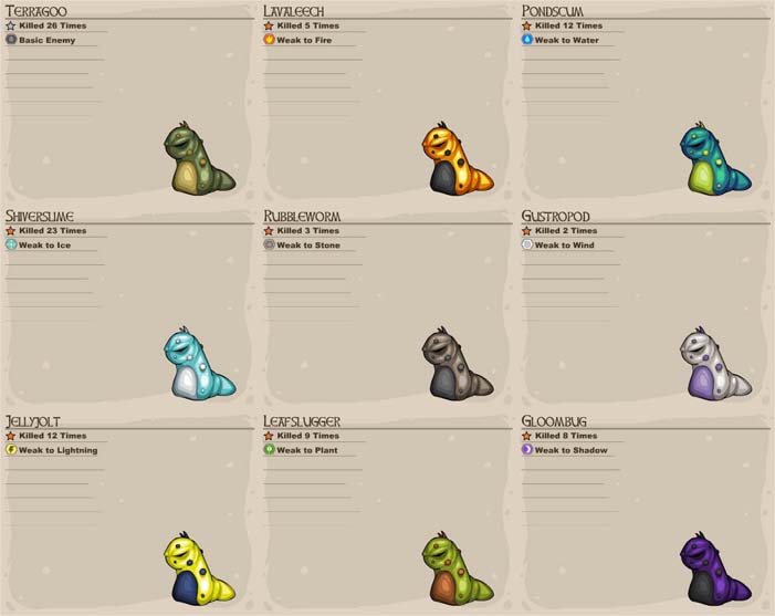 The first kind of slime that you will encounter. Wherever they go, they'll leave an obvious trail. Their diet is unknown. - Lavaleech